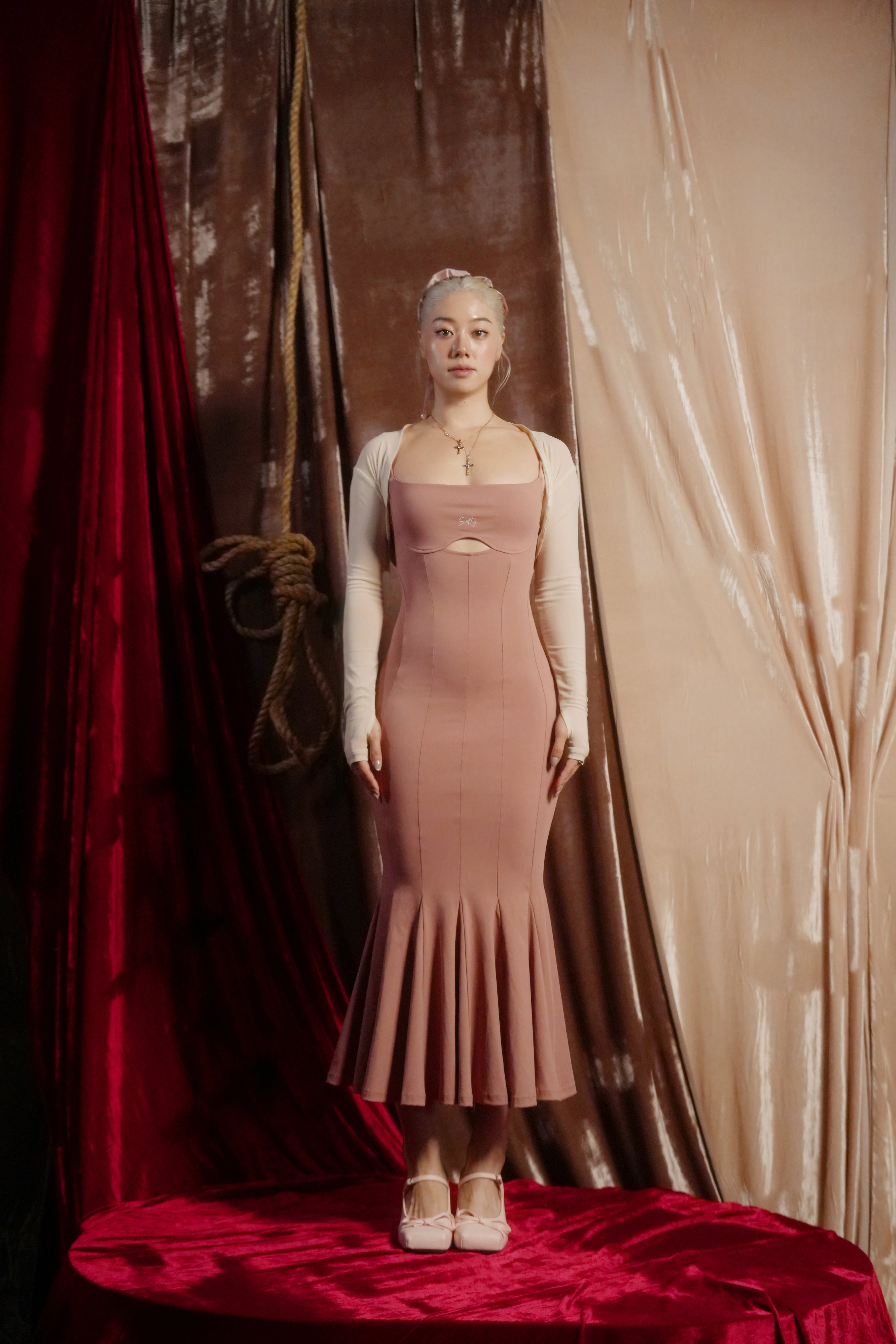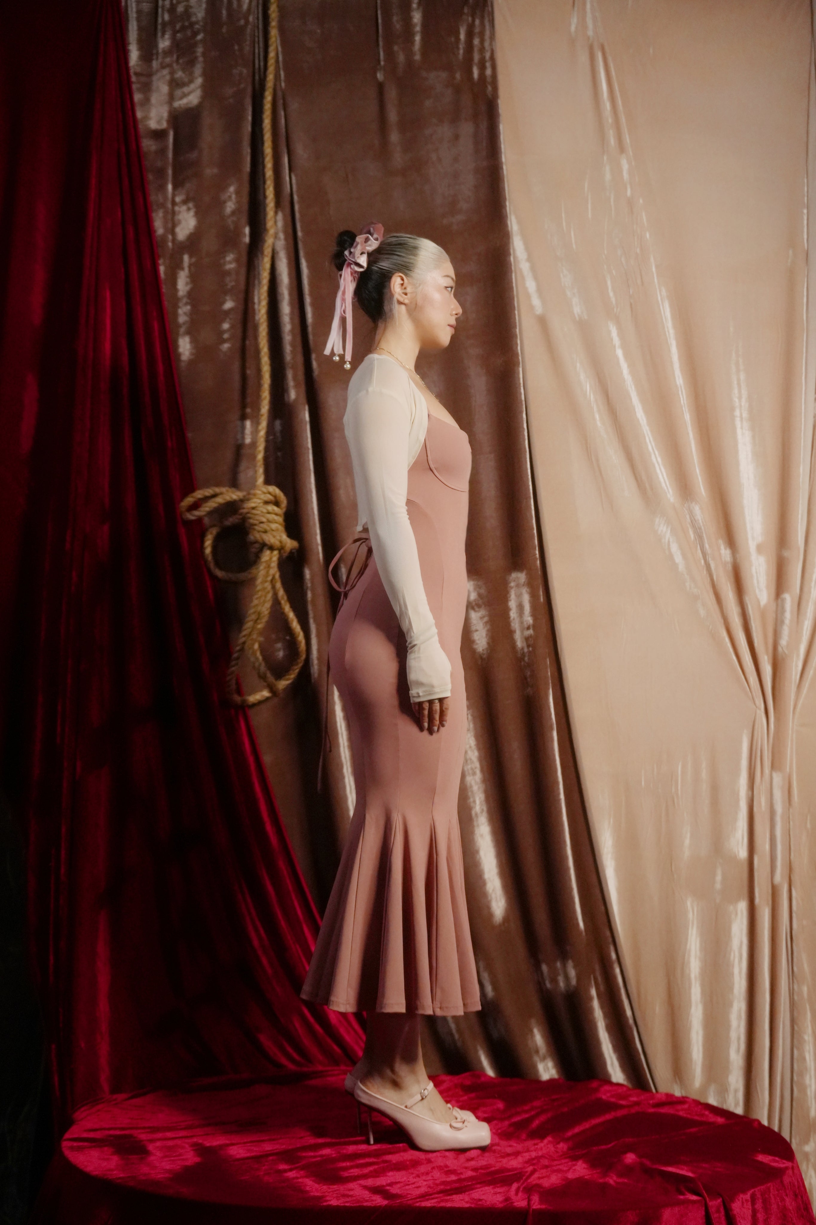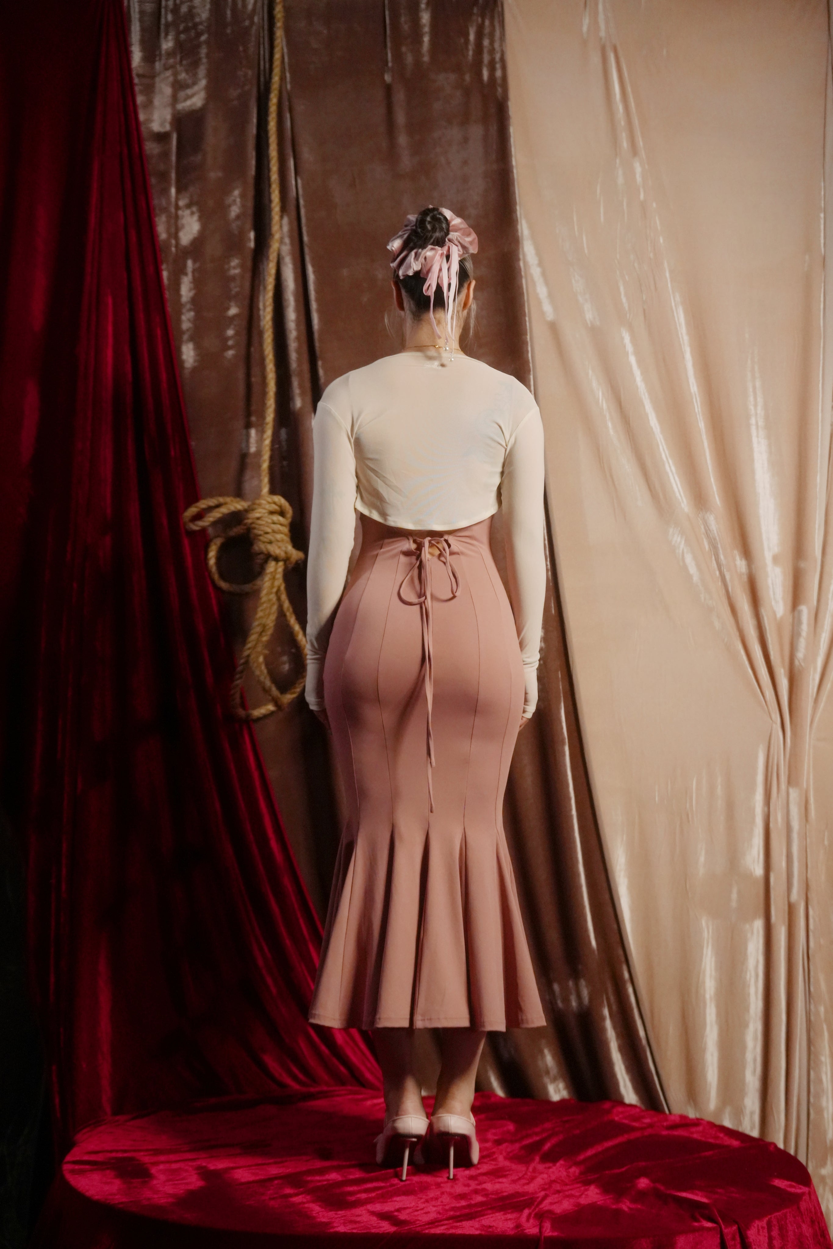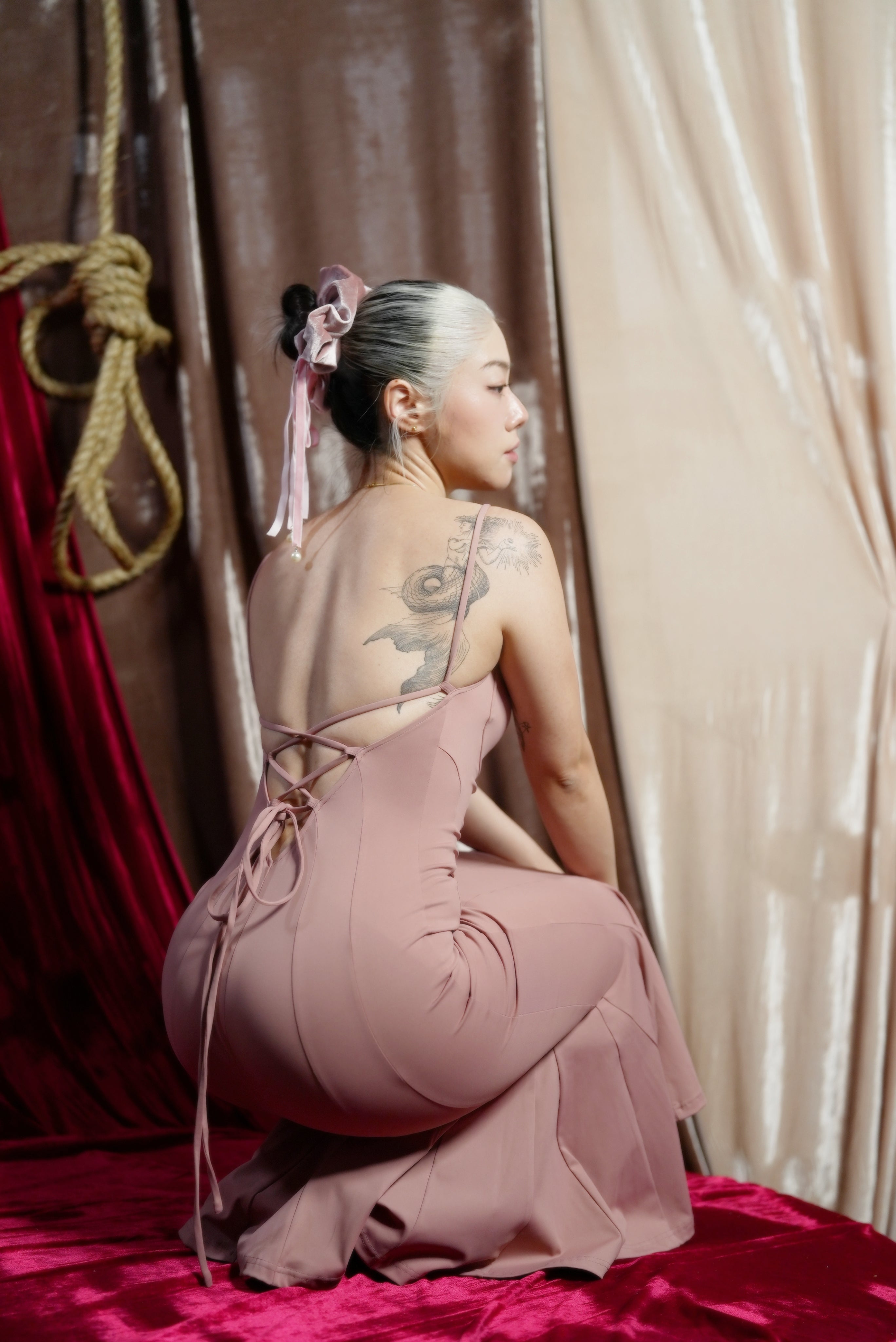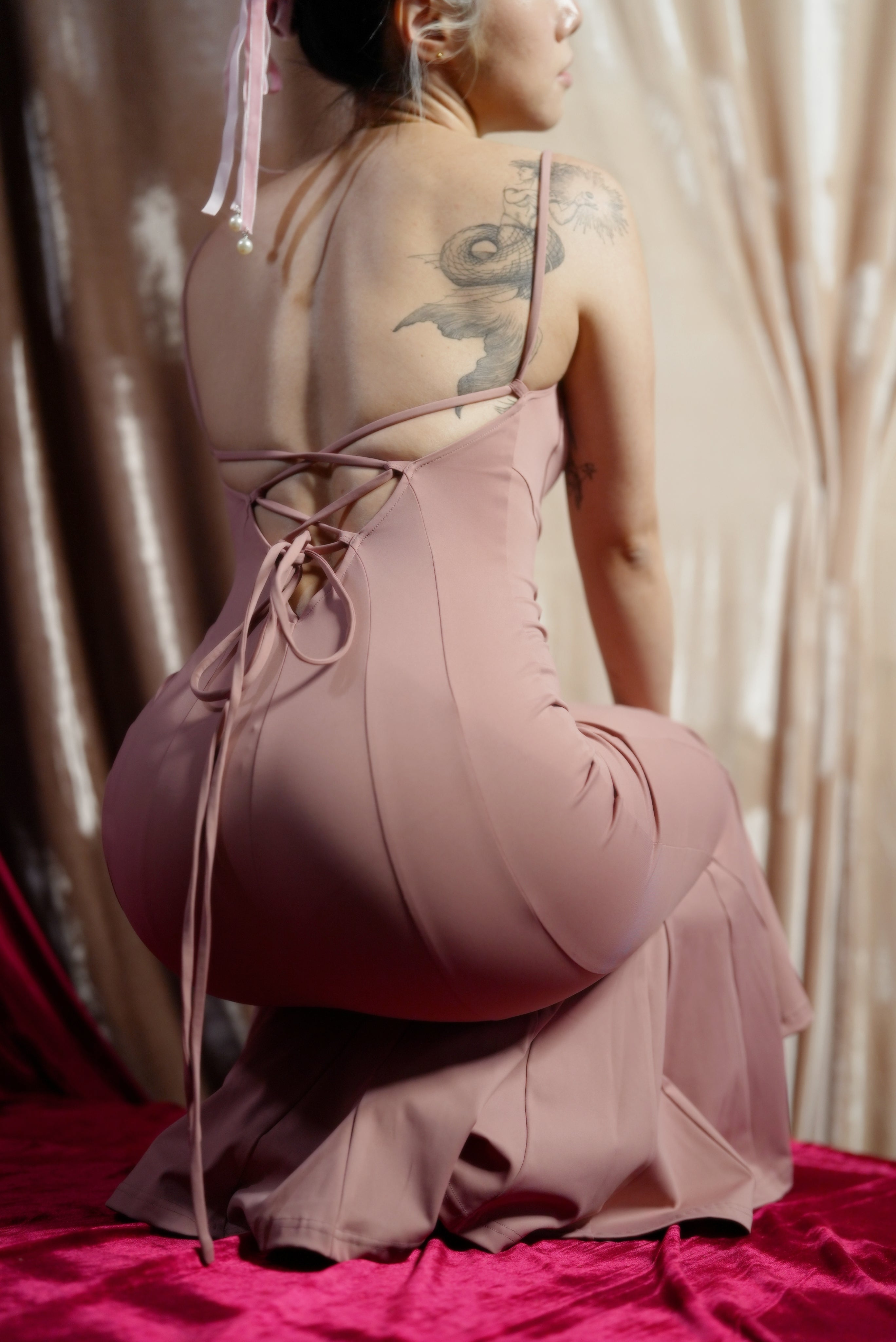 【Design Inspiration: A Pink Symphony in Mid-Air】 This Trapeze Artist dress belongs to the Swalty Sense collection, which focuses on sensual art. Its inspiration comes from the most elegant figure atop the circus tent—the trapeze artist. We captured the highly dynamic curve of the performer's back as they flip and extend in the air, and transformed it into this ultimate open-back design.