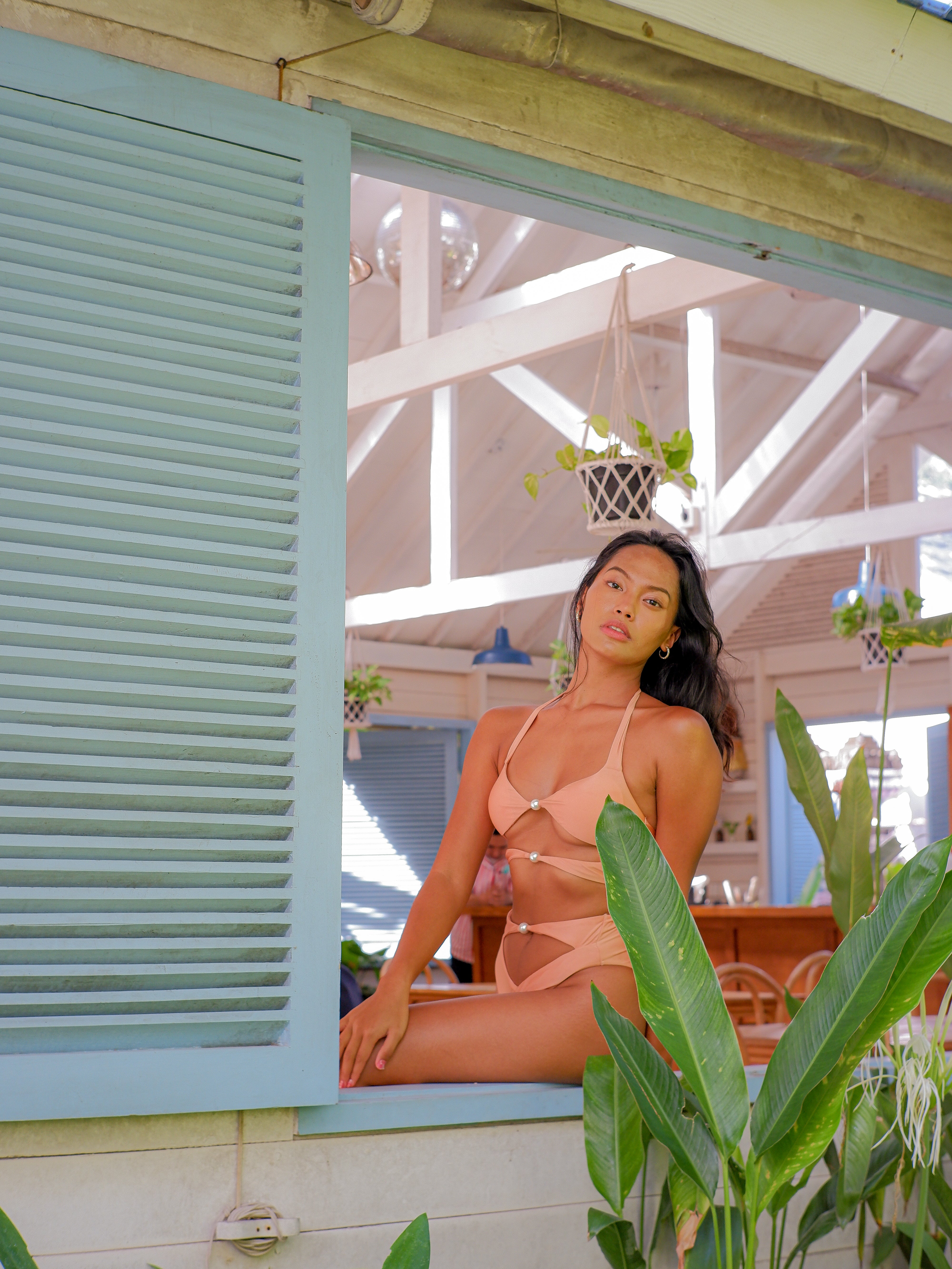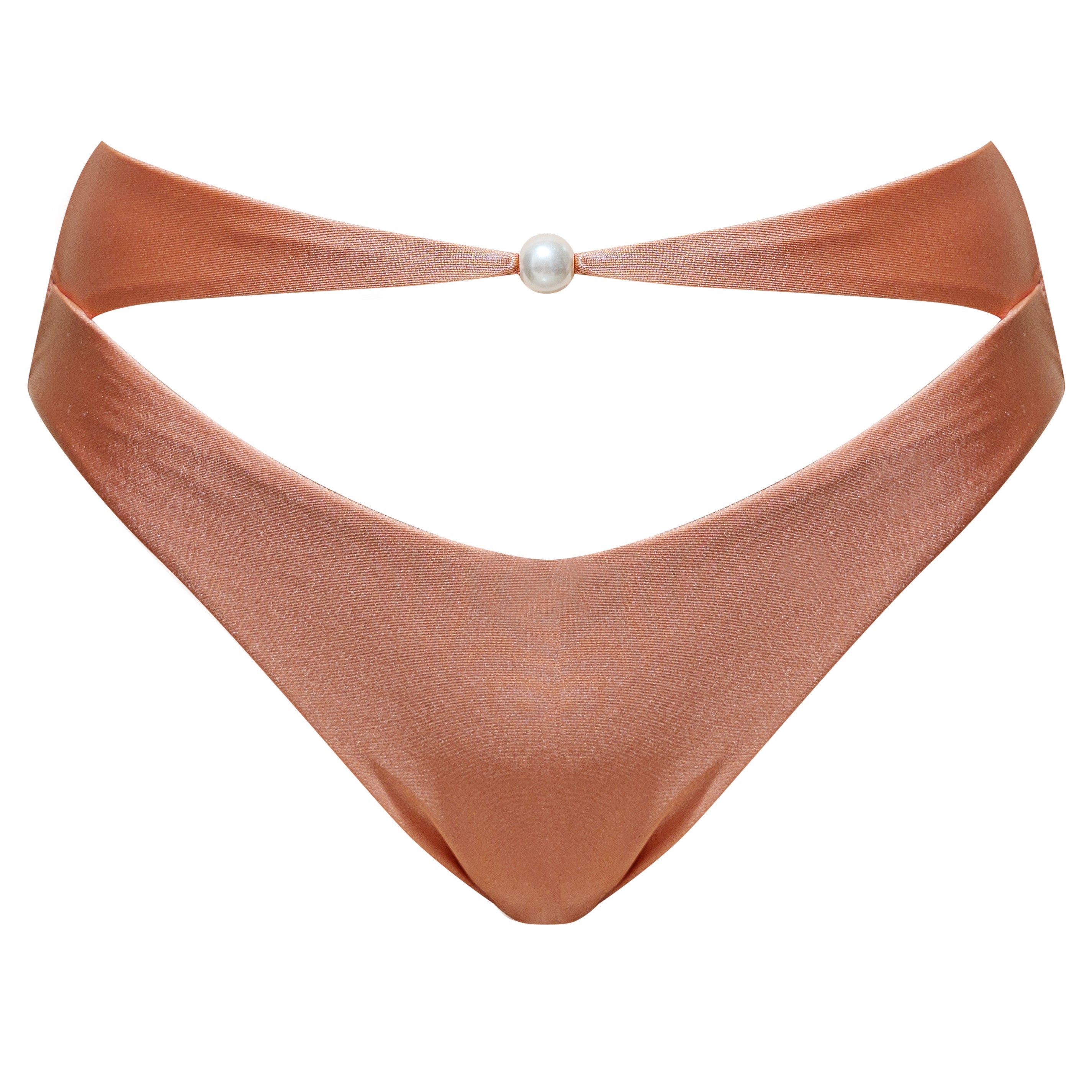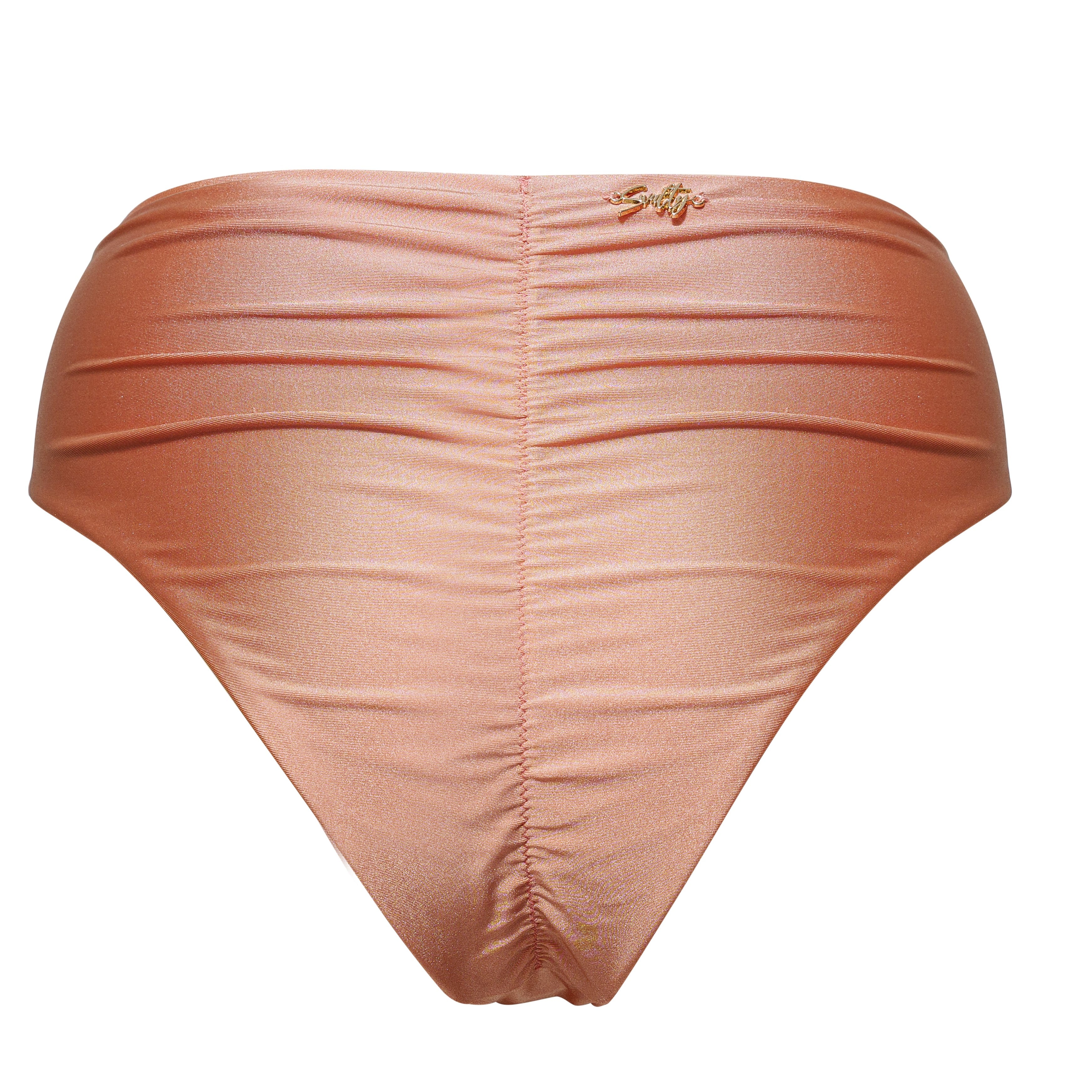 "We wanted to design swim trunks that you'll fall in love with your back when you put them on. The warmth of the caramel color and the strength of the gathered back are meant to allow girls to turn around confidently at the beach and show off their most vibrant curves."